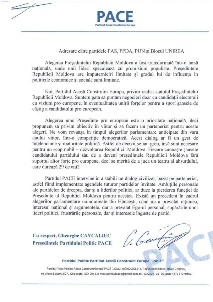 Partidul PACE, condus de fostul șef adjunct al IGP, Gheorghe Cavcaliuc, invită PAS, PPDA, PUN și Blocul Unirea la dialog. Formațiunea proaspăt înregistrată propune identificarea unui candidat unic pro-european pentru alegerile prezidențiale din acest an.