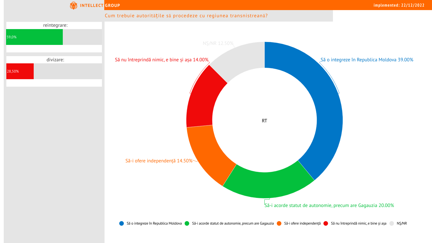 Sondajul republican cu privire la viața social-politică din Republica Moldova a fost realizat în perioada 01 – 20 decembrie 2022. Numărul total de respondenți este de 1209 de persoane cu drept de vot. Marja de eroare reprezintă +-2,9%.