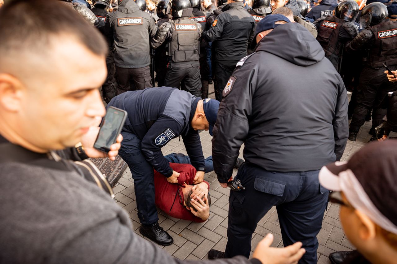 Miile de polițiști, mobilizați astăzi de guvernare i-au bătut pe câțiva tineri, pe care i-au luat cu forța și i-au urcat în microbuze. În spatele cordoanelor de polițiști stau simpatizanți ai președintelui Maia Sandu, care îi încurajează pe polițiști să-i agreseze pe manifestanți au strigat : „Așa, uciși!”.