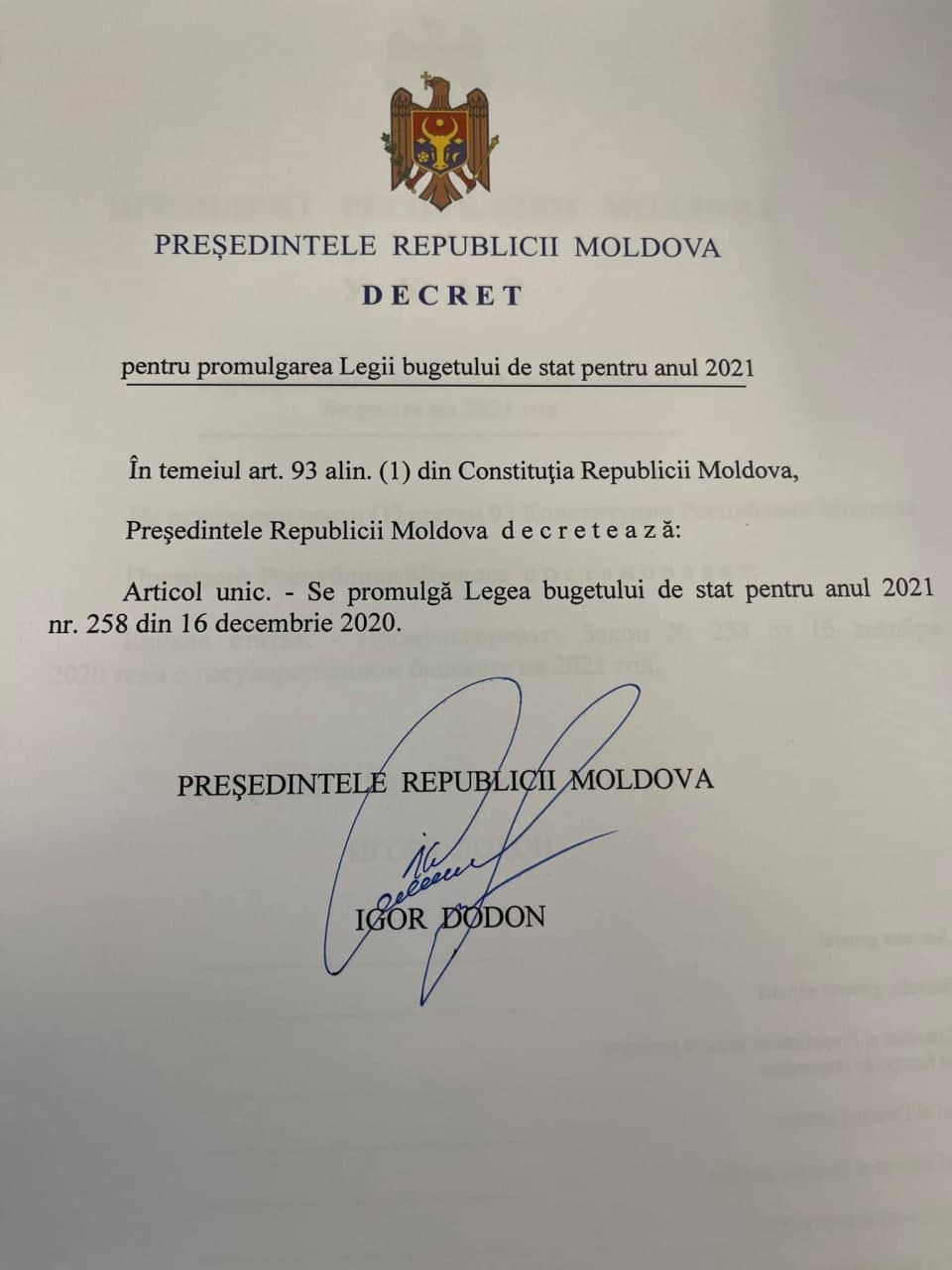 Igor Dodon a promulgat Legea cu privire la Bugetul de Stat pentru anul 2021 și politica bugetar fiscală și vamală.