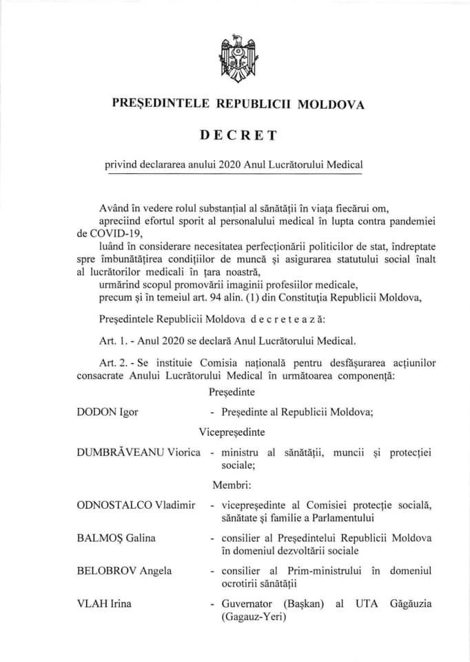 Igor Dodon a semnat astăzi un decret prin care am declarat anul 2020 – Anul Lucrătorului Medical în Republica Moldova.