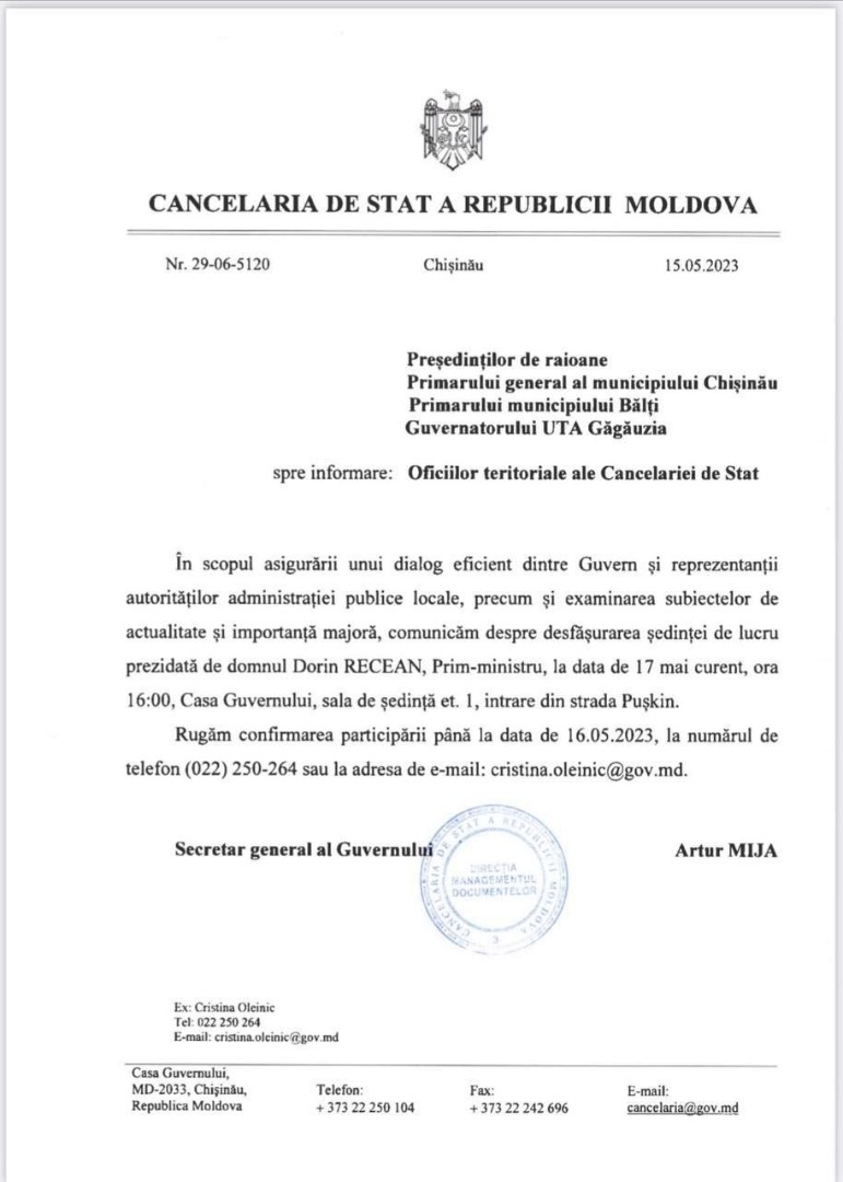 Într-o intervenție live pe Facebook, Dinu Țurcanu a anunțat că premierul vrea să-i convoace pe președinții de raion, primarii municipiilor Chișinău și Bălți și bașcanul Găgăuziei pentru a discuta „subiecte de actualitate și de importanță majoră”.