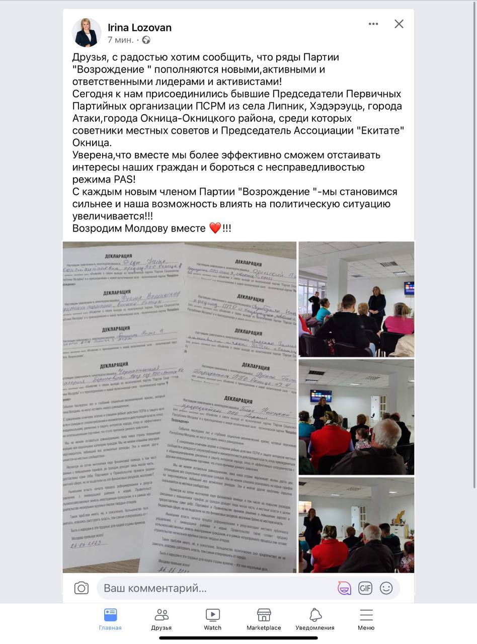 Pe pagina sa de Facebook, fosta deputată socialistă Irina Lozovan, și-a exprimat încrederea că Partidul „Renaștere”, cu astfel de lideri și activiști responsabili, va reuși să apere mai bine interesele cetățenilor și să lupte împotriva nedreptății regimului PAS!