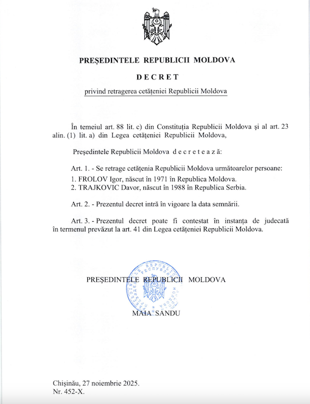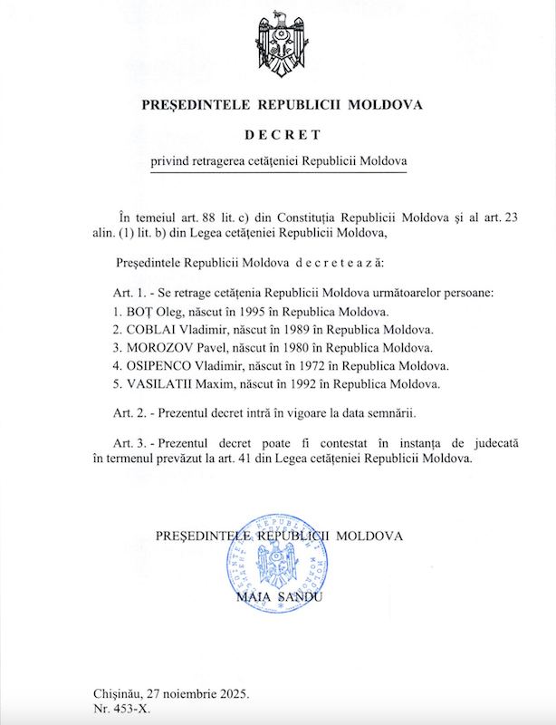 Președinta Republicii Moldova, Maia Sandu, a semnat două decrete privind retragerea cetățeniei pentru șapte persoane. Anunțul a fost făcut de purtătorul de cuvânt al Președinției, Igor Zaharov. Potrivit acestuia, cinci dintre persoanele vizate sunt înrolate în Grupul Operativ al Trupelor Ruse (GOTR), dislocat ilegal pe teritoriul Republicii Moldova.