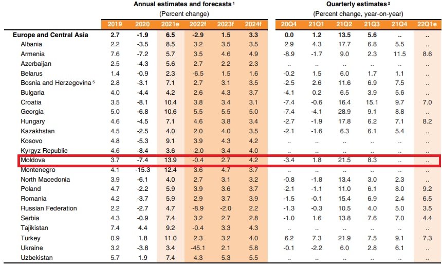 Republica Moldova va intra în recesiune în acest an. Sunt prognozele Băncii Mondiale expuse în raportul de vară „Perspective Economice Globale”. Se așteapta că economia țării noastre va scădea cu 0.4%, după o creștere de 14% anul trecut. Pentru anul viitor este prognozată o creștere de doar 2,7%, iar pentru anul 2024 – creștere de 4.2%.
