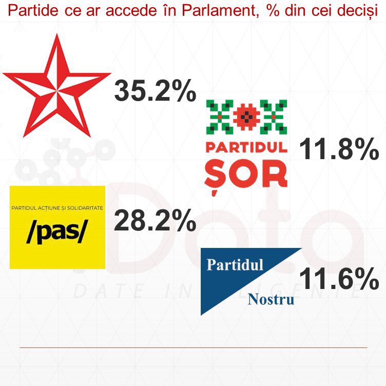 Conform studiului, în Parlament ar accede patru formațiuni politice, iar favorit rămâne Partidul Socialiștilor din Republica Moldova. Astfel, datele sondajului arată că pentru PSRM ar vota 35,2% din respondenții deciși, PAS ar obține 28,2% din sufragii, urmează PP ”Șor” – cu 11,8% și Partidul Nostru – cu 11,6%.