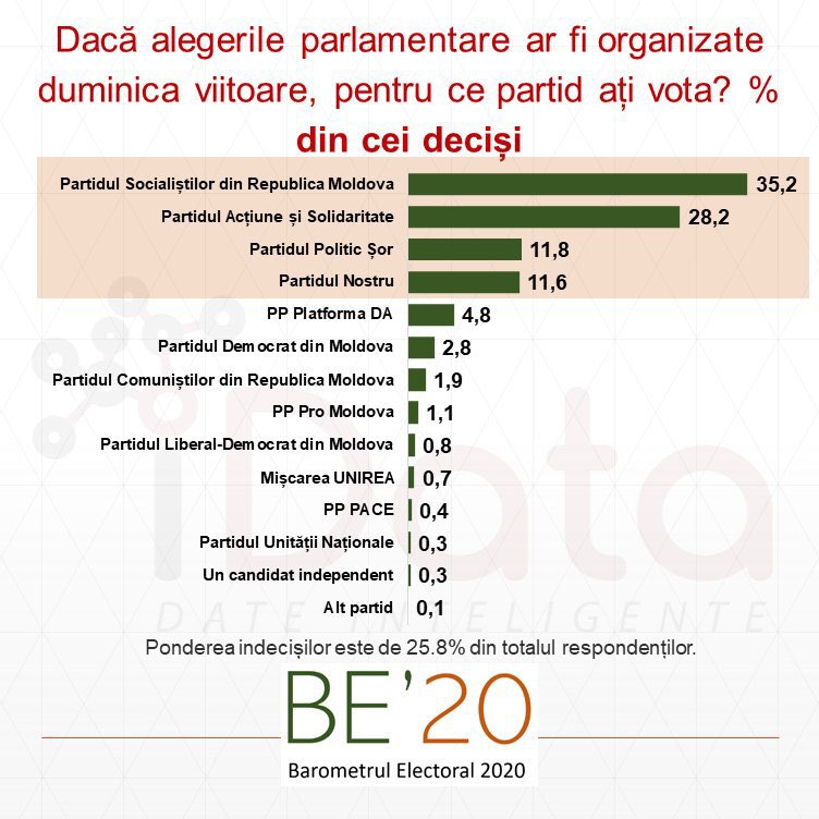 Conform studiului, în Parlament ar accede patru formațiuni politice, iar favorit rămâne Partidul Socialiștilor din Republica Moldova. Astfel, datele sondajului arată că pentru PSRM ar vota 35,2% din respondenții deciși, PAS ar obține 28,2% din sufragii, urmează PP ”Șor” – cu 11,8% și Partidul Nostru – cu 11,6%.