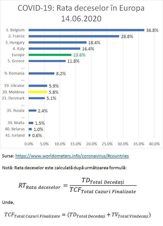 Rata mortalității din cauza COVID-19 în Moldova este de 5,8%, de 2,3 ori mai mică decât media europeană, care la data de 14 iunie constituie 13,6%. Despre aceasta scrie expertul economic Veaceslav Ioniță. Potrivit unui top, realizat de Ioniță, Republica Moldova se află pe locul 20 în Europa, după rata deceselor.