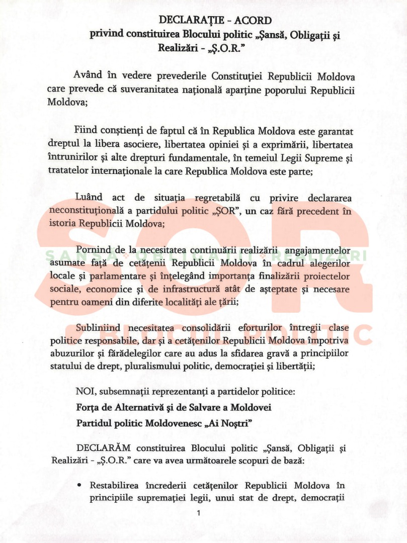 „Toate celelalte forțe politice, primari, consilieri locali, raionali, persoane cu funcții de demnitate publică și toți cetățenii care nu sunt de acord cu acțiunile abuzive ale guvernării și sunt gata să lupte pentru supremația legii, pluralismul politic, democrație, libertate, viitor luminos și prosper pentru Republica Moldova, sunt invitați să se alăture cât mai curând la Blocul „Ș.O.R.” Moldova este Patria noastră! Moldova este viața și viitorul nostru! Moldova așteaptă unitate și consolidare! Moldova merită și va fi liberă!”, se arată în declarația-acord semnată de reprezentanții Blocului politic „Ș.O.R”.