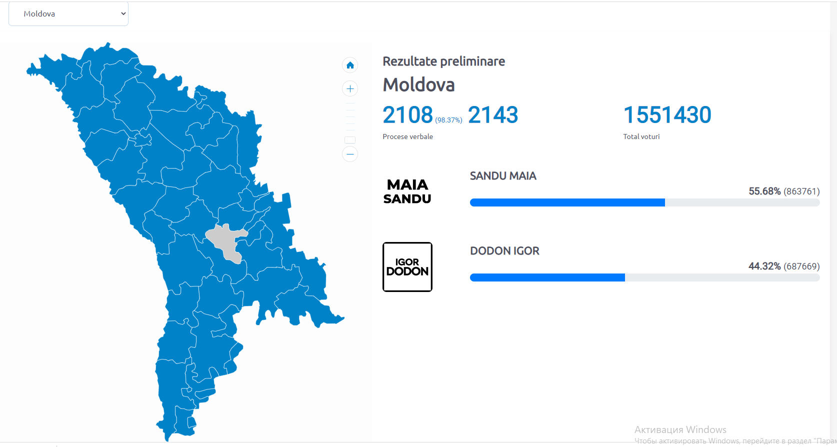 După procesarea a 98% din procesle verbale, devine clar că Moldova are un nou șef al statului. Cu peste 863 de mii de voturi, Maia Sandu devine noua președintă a Republicii Moldova.