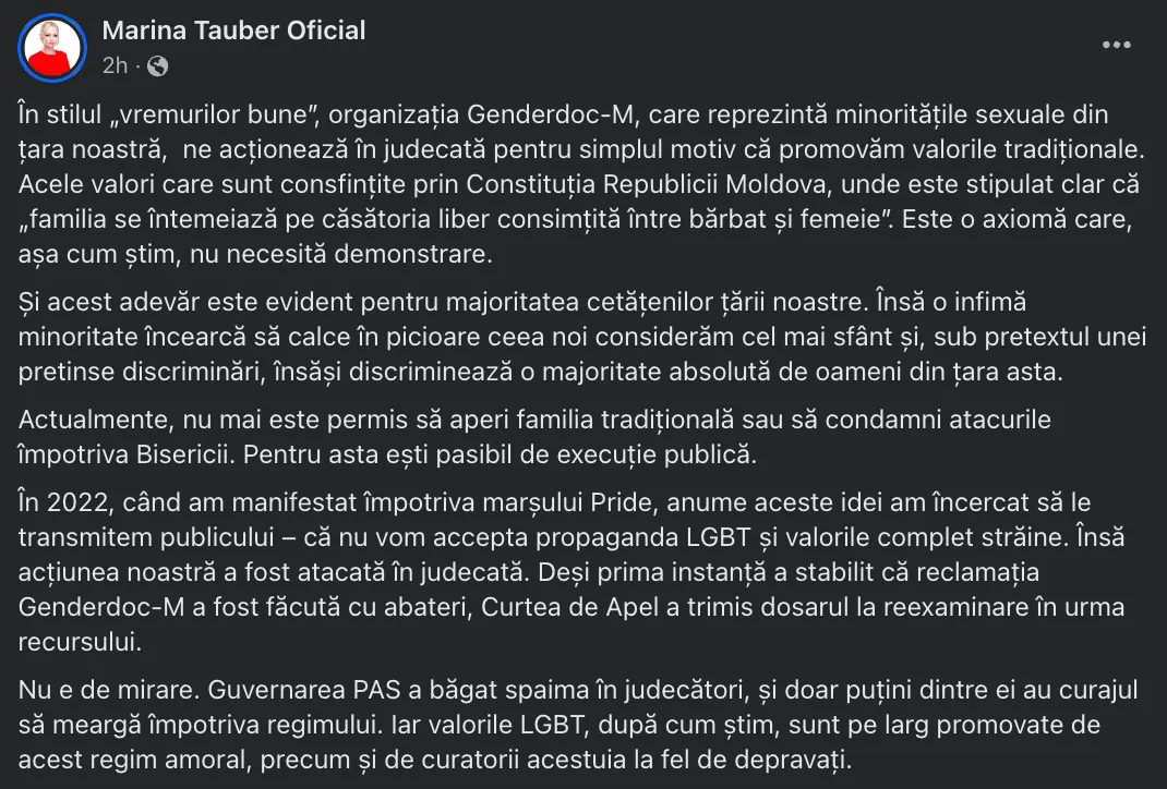 „În stilul „vremurilor bune”, organizația Genderdoc-M, care reprezintă minoritățile sexuale din țara noastră, ne acționează în judecată pentru simplul motiv că promovăm valorile tradiționale. Acele valori care sunt consfințite prin Constituția Republicii Moldova, unde este stipulat clar că „familia se întemeiază pe căsătoria liber consimţită între bărbat şi femeie”. Este o axiomă care, așa cum știm, nu necesită demonstrare”, a scris Tauber pe Facebook.