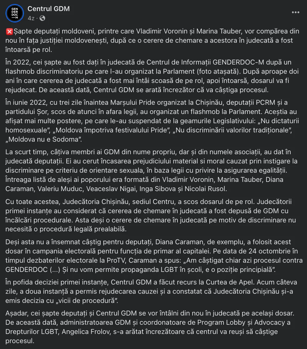„În iunie 2022, cu trei zile înaintea Marșului Pride organizat la Chișinău, deputații PCRM și a partidului Șor, scos de atunci în afara legii, au organizat un flashmob la Parlament. Aceștia au afișat mai multe postere, pe care le-au suspendat de la geamurile Legislativului: „Nu dictaturii homosexuale”, „Moldova împotriva festivalului Pride”, „Nu discriminării valorilor tradiționale”, „Moldova nu e Sodoma””, se arată în mesajul Centrului.