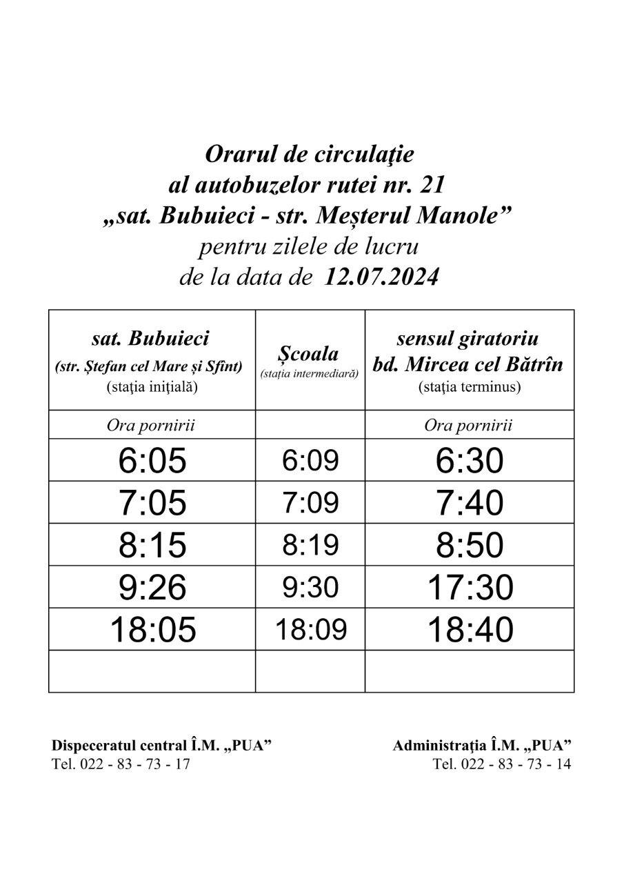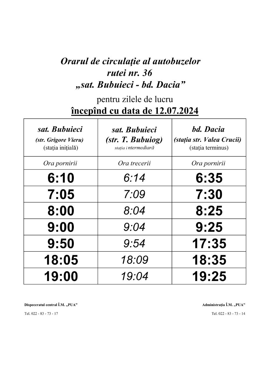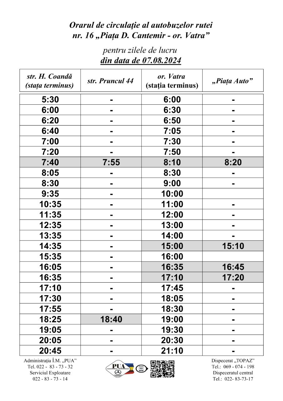 „De asemenea, din data de 07.08.2024, vor surveni schimbări și în orarul de circulație a rutei suburbane de autobuz Nr. 16 „Piața Dm. Cantemir – or. Vatra” ”, subliniază edilul.