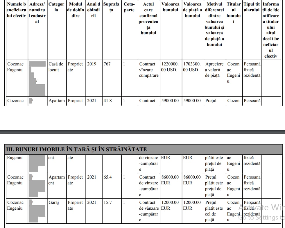 Potrivit declarației de avere și interese personale, în 2021, Eugeniu Cozonac a procurat un apartament cu o suprafață de 41,8 metri pătrați, pentru care a achitat 59 de mii de euro și un apartament de 65 de metri pătrați, care l-a costat 86 de mii de euro. În declarație se regăsește și un garaj de 12 mii euro, care de asemenea a fost procurat anul trecut.