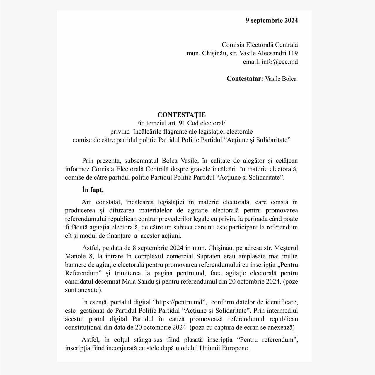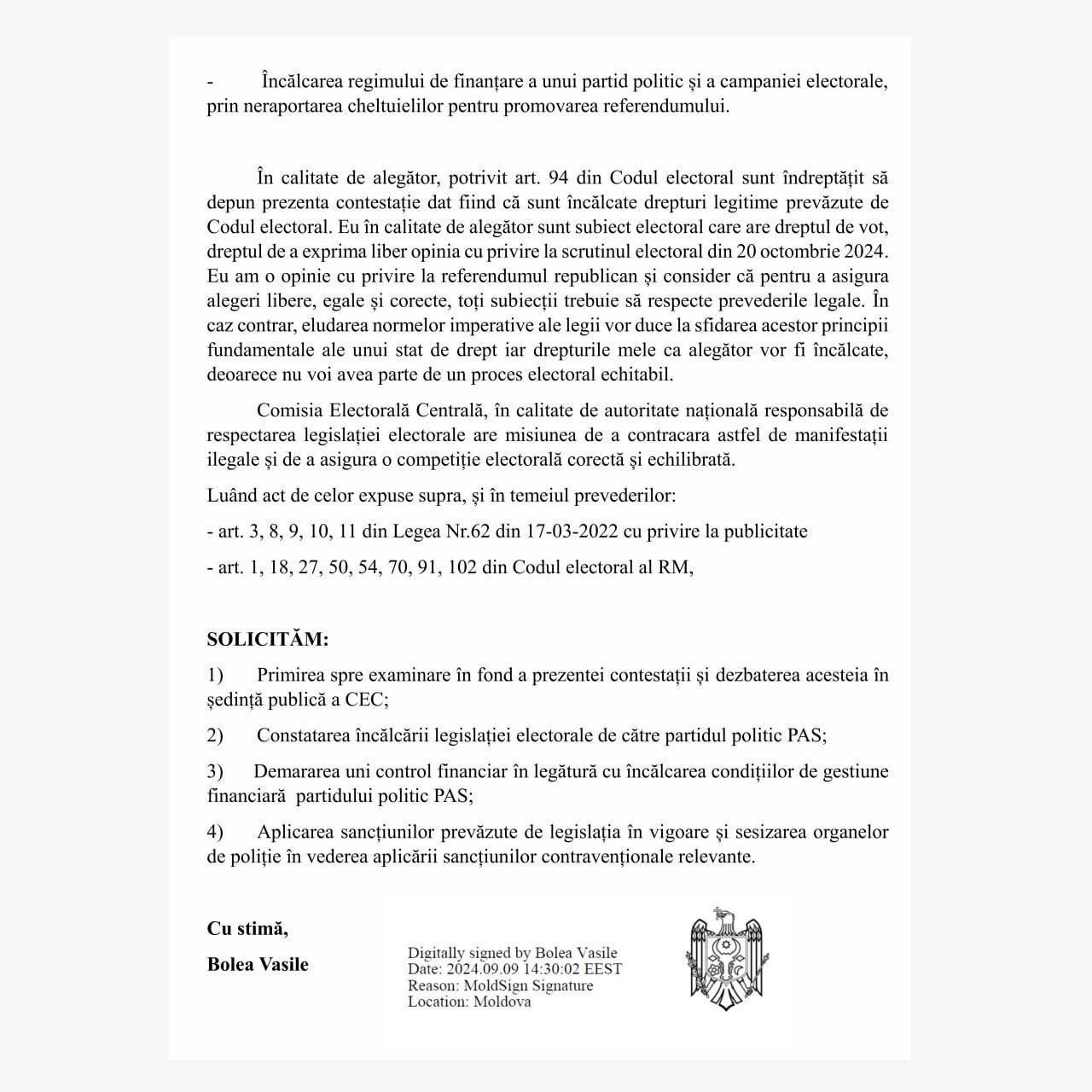 Vasile Bolea a depus o plângere la Comisia Electorală Centrală privind încălcările legislației electorale de către partidul de guvernământ PAS. În adresarea sa, el a menționat o campanie de propagandă pe scară largă pe care partidul Maiei Sandu o desfășoară înainte de perioada de agitație stabilită de lege.
