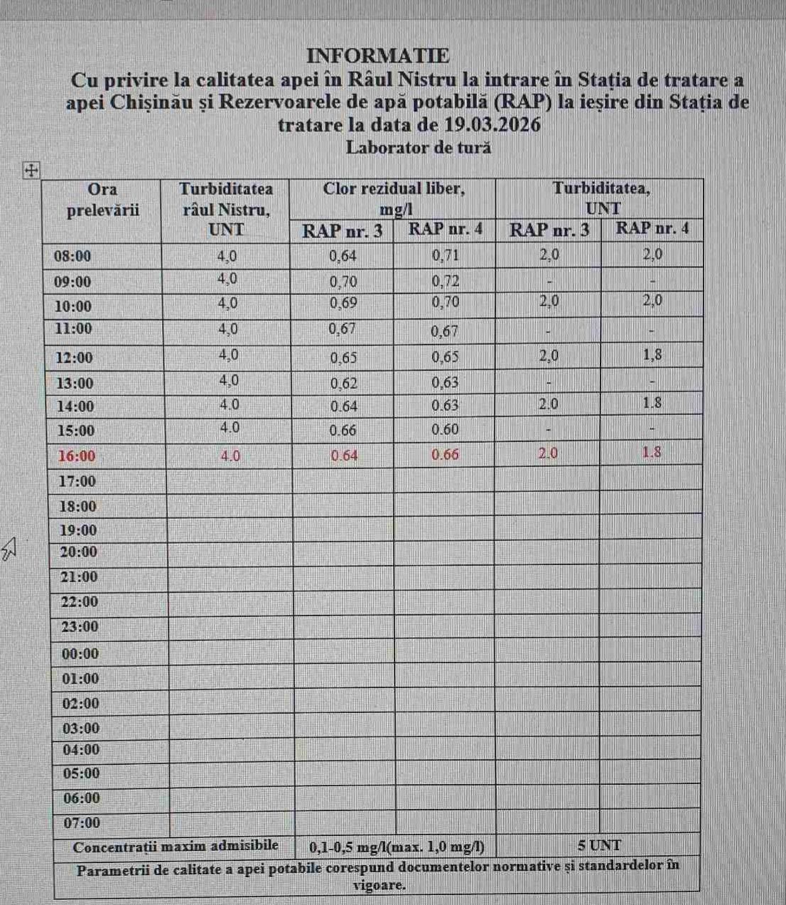 Situația privind calitatea apei din râul Nistru este stabilă în acest moment, iar alimentarea cu apă a municipiului Chișinău nu este pusă în pericol. Anunțul a fost făcut de autoritățile municipale, care dau asigurări că nu există abateri de la normele admise.Potrivit datelor prezentate, analizele efectuate în ultimele 24 de ore confirmă că apa se încadrează în parametrii de siguranță, cele mai recente rezultate fiind înregistrate la ora 16:00.Verificările au fost realizate la Stația de captare a apei de la Vadul lui Vodă, aflată în gestiunea companiei S.A. „Apă-Canal Chișinău”, precum și la intrarea în Stația de tratare a apei și la ieșirea din rezervoarele de apă potabilă. În toate punctele controlate, indicatorii analizați au rămas în limitele admise.Reprezentanții Primăriei Chișinău precizează că monitorizarea va continua în regim permanent, iar informații actualizate vor fi oferite la fiecare trei ore.Totodată, cetățenii sunt îndemnați să se informeze doar din surse oficiale pentru a evita răspândirea informațiilor eronate.