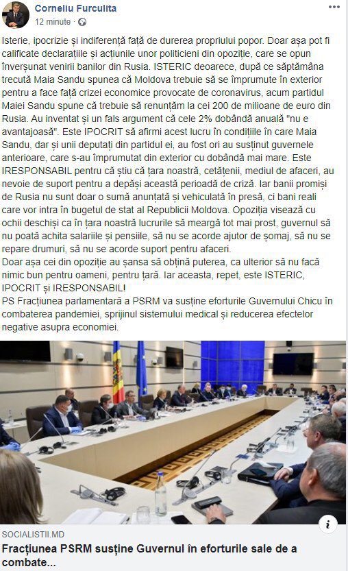 „ISTERIC deoarece, după ce săptămâna trecută Maia Sandu spunea că Moldova trebuie să se împrumute în exterior pentru a face față crizei economice provocate de coronavirus, acum partidul Maiei Sandu spune că trebuie să renunțăm la cei 200 de milioane de euro din Rusia. Au inventat și un fals argument că cele 2% dobândă anuală „nu e avantajoasă”. Este IPOCRIT să afirmi acest lucru în condițiile în care Maia Sandu, dar și unii deputați din partidul ei, au fost ori au susținut guvernele anterioare, care s-au împrumutat din exterior cu dobândă mai mare. Este IRESPONSABIL pentru că știu că țara noastră, cetățenii, mediul de afaceri, au nevoie de suport pentru a depăși această perioadă de criză”, a scris Furculiță.