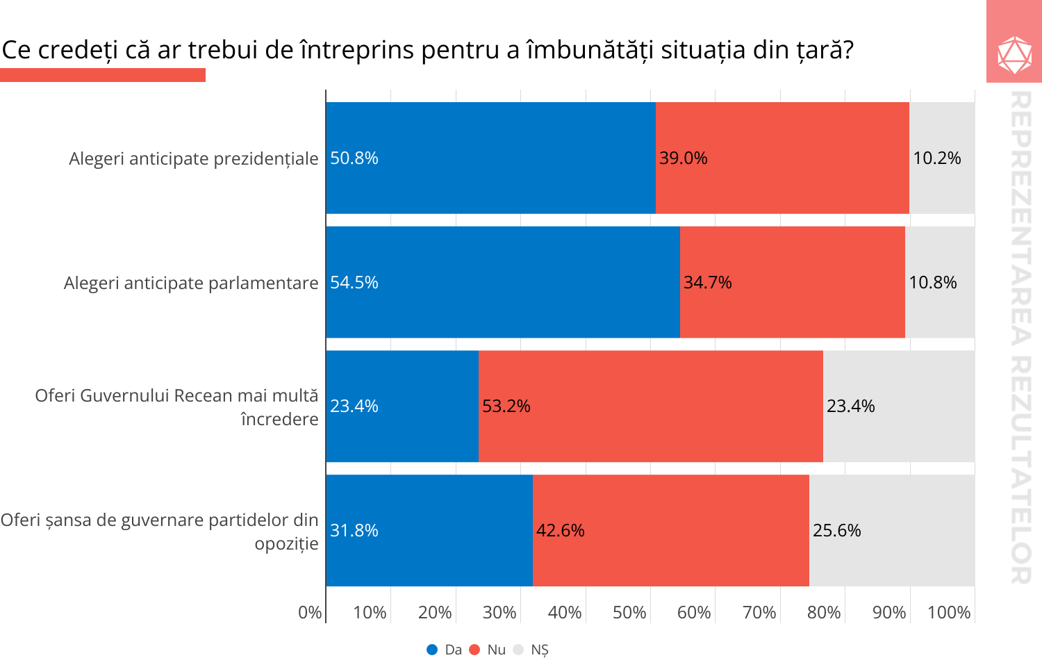 O minoritate – mai puțin de o treime – consideră că este necesar să se mențină încrederea în actualul guvern Recean, în timp ce o minoritate comparabilă (30%) susține ideea de a oferi opoziției posibilitatea de a-și forma propriul guvern.