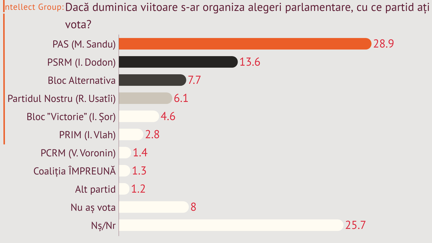 Un sondaj recent realizat de compania „Intellect Group” privind intențiile de vot pentru alegerile parlamentare din Republica Moldova arată că Partidul Acțiune și Solidaritate (PAS), condus de Maia Sandu, conduce cu 28,9% din preferințele generale ale populației, urmat de Partidul Socialiștilor din Republica Moldova (PSRM), cu 13,6%, și de Blocul Alternativa, care obține 7,7%. Pe locurile următoare se află Partidul Nostru (Renato Usatîi) cu 6,1%, iar Blocul „Victorie” (Ilan Șor) înregistrează 4,6%.