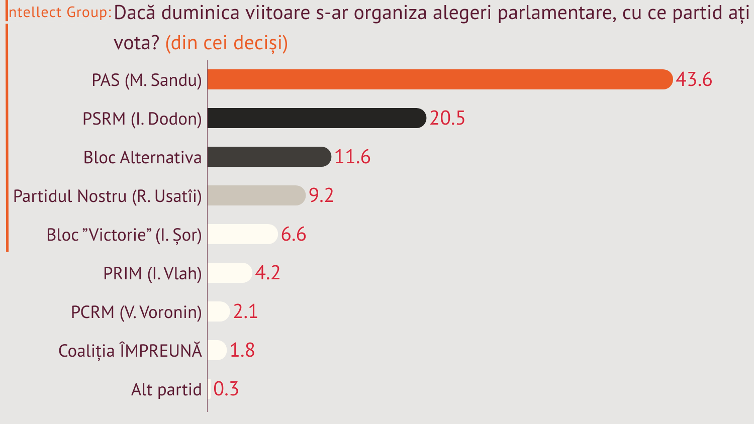 În rândul celor care sunt deja deciși să voteze, PAS se află pe primul loc cu 43,6%, urmat de PSRM cu 20,5%. Alte procente se împart între Blocul Alternativa (11,6%), Partidul Nostru (9,2%), Blocul „Victorie” (6,6%), PRIM (4,2%), PCRM (2,1%), Coaliția ÎMPREUNĂ (1,8%) și alte partide care obțin procente mai mici.