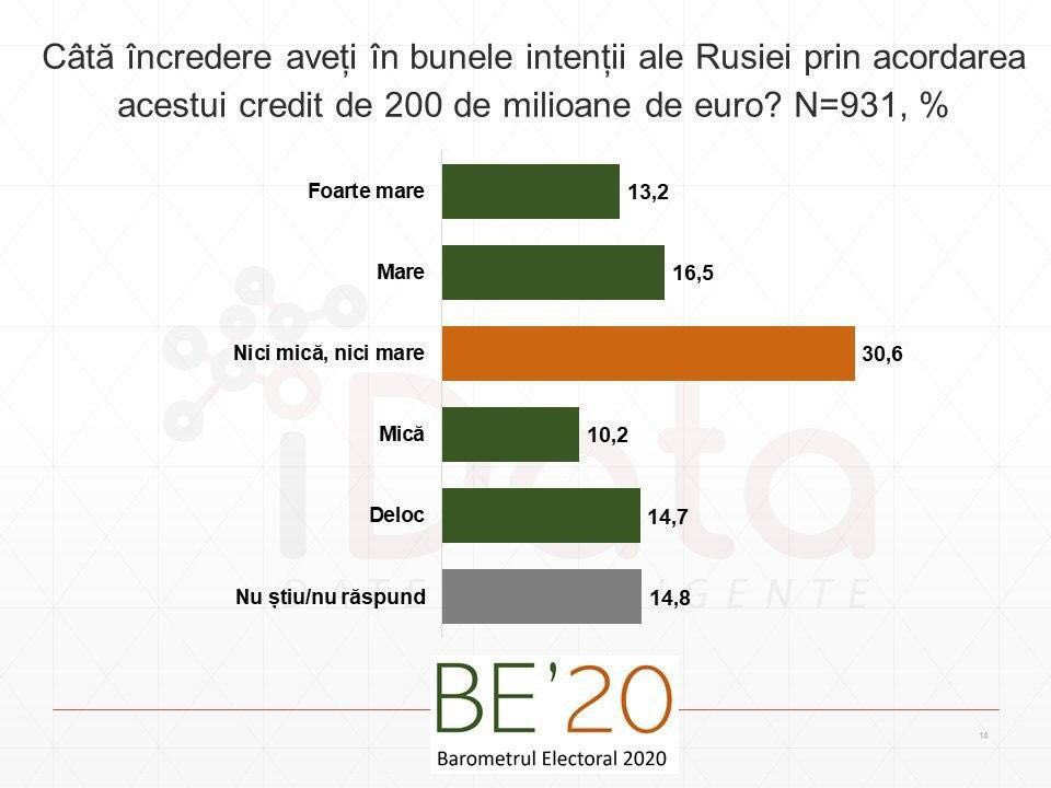 Totodată, respondenții u fost întrebați câtă încredere au în bunele intenții ale Rusiei prin acordarea acestui credit. 29,7% au spus că au încredere mare sau chiar foarte marte, 30,6% – nici mică, nici mare, 10,2 la sută au spus că încrederea este mică și doar 14,7% au declarat că nu au încredere.