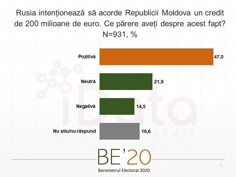 Aproape că fiecare al doilea moldovean are o părere bună despre decizia Moscovei de a ne acorda un credit de 200 mln de euro. Sunt datele Barometrului electoral 2020, realizat de IData, ediția de mai.