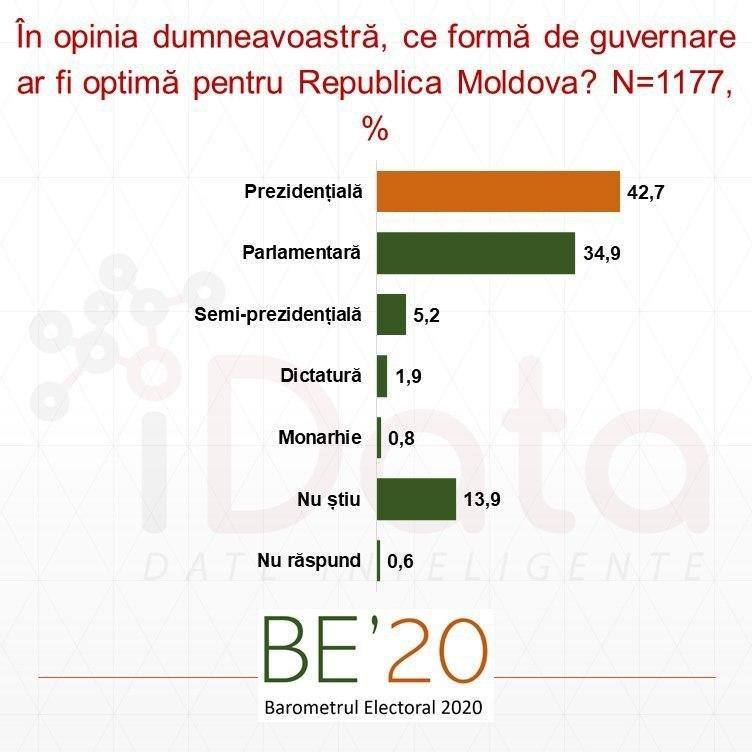 Cei mai mulți cetățeni consideră că Republica Moldova trebuie să fie stat prezidențial. De această părere sunt 42,7 la sută din respondenți, care au participat la Barometrul Electoral – ediția de august, realizat de compania IData. Totodată, aproape 35% spun că țara noastră trebuie să rămână stat parlamentar, iar 5,2% – semi-prezidențial. Aproape două la sută din cetățeni și-ar dori ca în Republica Moldova să fie dictatură, iar mai puțin din 1% – monarhie. Ceilalți respondenți nu au știut sau nu au dorit să răspundă la această întrebare.