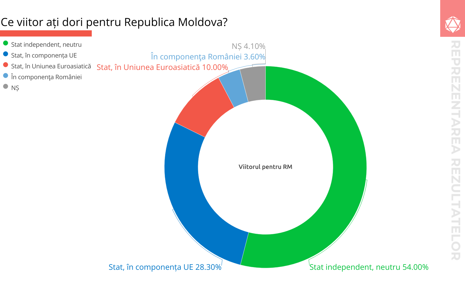 Conform datelor prezentate de compania Intellect Group, o majoritate puternică (54%) continuă să vadă viitorul țării drept unul neutru și suveran. Aproape o treime dintre respondenți văd viitorul țării ca parte a UE (28%), 10% – parte Euro-asiatică. Iar minoritatea tradițională, aproximativ 3-4%, este în favoarea unirii cu România.
