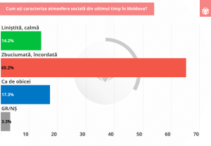 Conform unui nou studiu realizat de Grupul Intellect, majoritatea moldovenilor caracterizează atmosfera socială din țară ca fiind neliniștită și tensionată. Potrivit datelor obținute în cadrul sondajului realizat în perioada 25-28 aprilie 2024, 65,2% dintre respondenți au indicat că simt o anumită tensiune în societate.