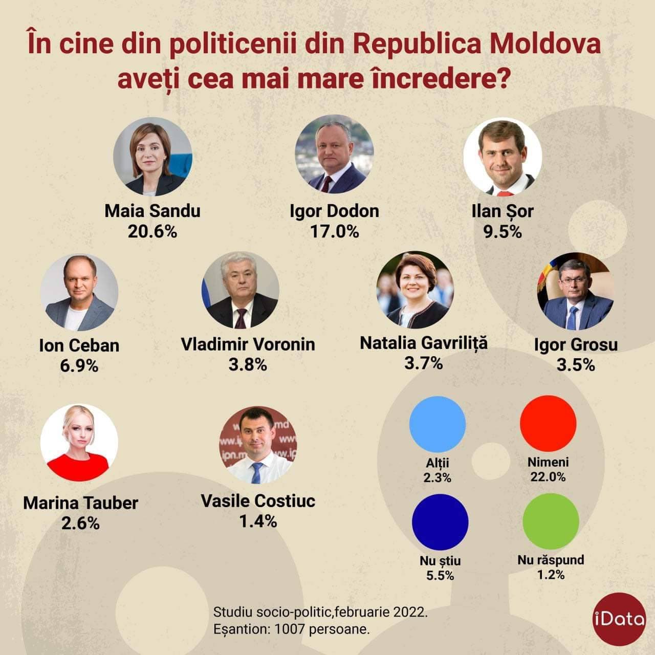 La capitolul încrederii din partea populației, cei mai influenți politicieni rămân Maia Sandu, Igor Dodon și Ilan Șor. Șeful statului se bucură de încrederea a peste 20 la sută din populație, Igor Dodon acumulează 17 la sută, iar Ilan Șor aproape 10 procente. Premierul Natalia Gavriliță și președintele Parlamentului Igor Grosu sunt abia pe locurile 6 și, respectiv, 7.