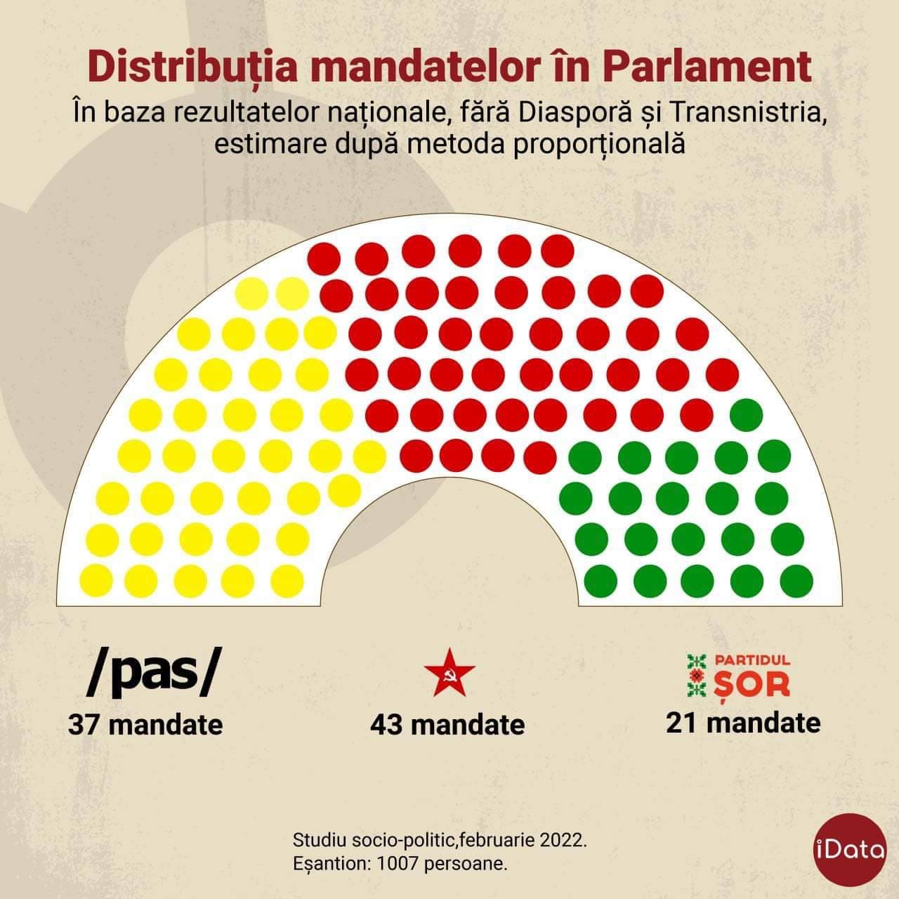 Continuă trendul descendent al partidului de guvernare, PAS, în timp ce Partidul Șor și PSRM adună tot mai mulți simpatizanți, arată datele celui mai recent sondaj iData, publicat astăzi. Astfel, în cazul unor alegeri parlamentare anticipate, Partidul „ȘOR” ar acumula 21 de mandate în Parlament, cu două mai multe decât la sondajul de acum o lună, iar PAS s-ar alege cu 37 de mandate de deputat, cu șase mai puține decât la sondajul precedent. În același timp, PSRM, împreună cu PSRM, ar acumula 43 de mandate de deputat, în creștere cu 10 mandate.