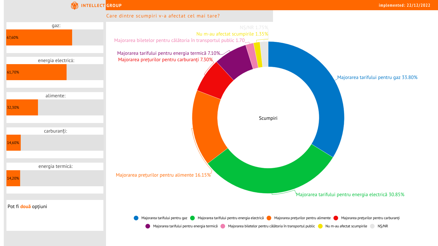 16,1% din participanții la sondaj au declarat că majorarea prețurilor la produsele alimentare bate la buzunar, iar 7,3 la sută spun că creșterea prețurilor la carburanți le-a afectat bugetul.