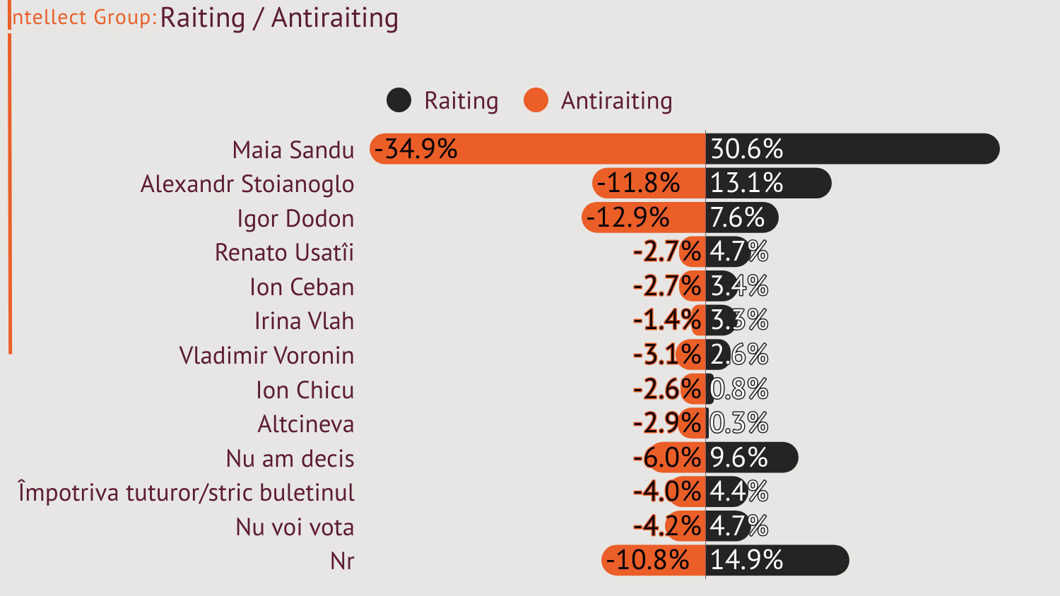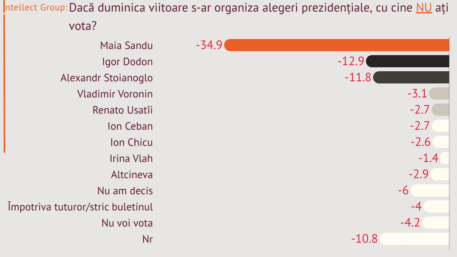 Potrivit sondajului, printre cei mai respinși candidați se mai numără Igor Dodon (-12,9%), Alexandr Stoianoglo (-11,8%) și Vladimir Voronin (-3,1%). Alte nume din topul antiratingului sunt Renato Usatîi (-2,7%), Ion Ceban (-2,7%), Ion Chicu (-2,6%) și Irina Vlah (-1,4%). Aceste cifre indică o criză de încredere în întreaga clasă politică și o dificultate crescută pentru oricare dintre candidați de a atrage sprijin larg în rândul electoratului.