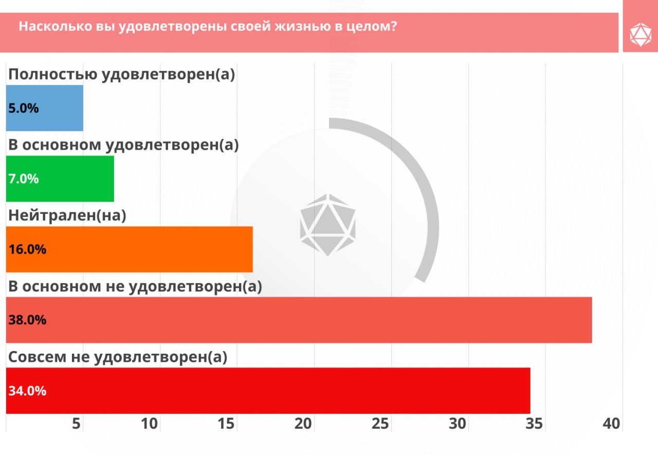 Conform unui studiu realizat recent de compania de cercetare politică și consultanță Intellect Group, majoritatea populației din Republica Moldova nu este mulțumită de viața lor. Datele relevă că doar 5% dintre respondenți se declară complet mulțumiți, în timp ce impresionanta cifră de 72% se situează în categoria celor mai puțin sau deloc mulțumiți. Această tendință este evidentă în special în rândul persoanelor de vârstă mijlocie și a celor în vârstă.
