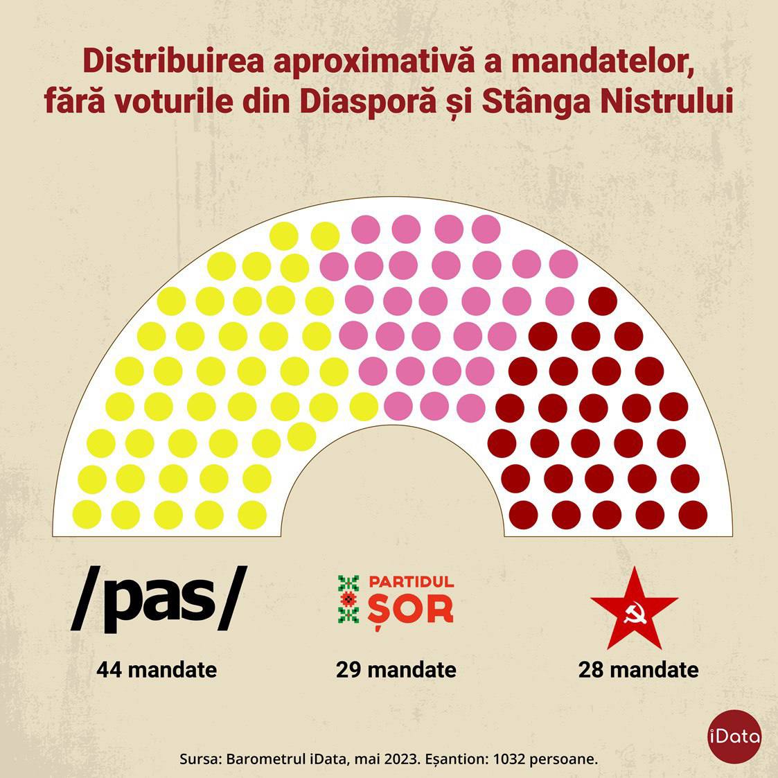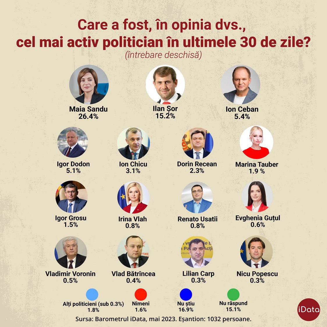 Sondajul iData a fost efectuat în perioada 23-30 mai 2023, pe un eșantion de 1032 de persoane din 373 de localități. Marja de eroare este de plus minus 3%.