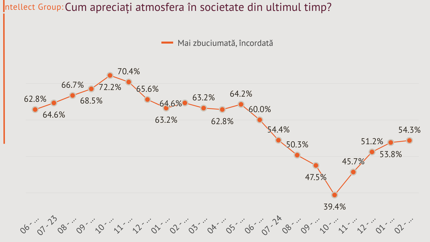 În perioada octombrie 2023 – februarie 2025, percepția asupra instabilității sociale a fluctuat, atingând un vârf de 72,2% în octombrie 2023, influențată de criza economică și tensiunile geopolitice. După o scădere până la 39,4% în octombrie 2024, nivelul de tensiune a crescut din nou, ajungând la 54,3% în februarie 2025.