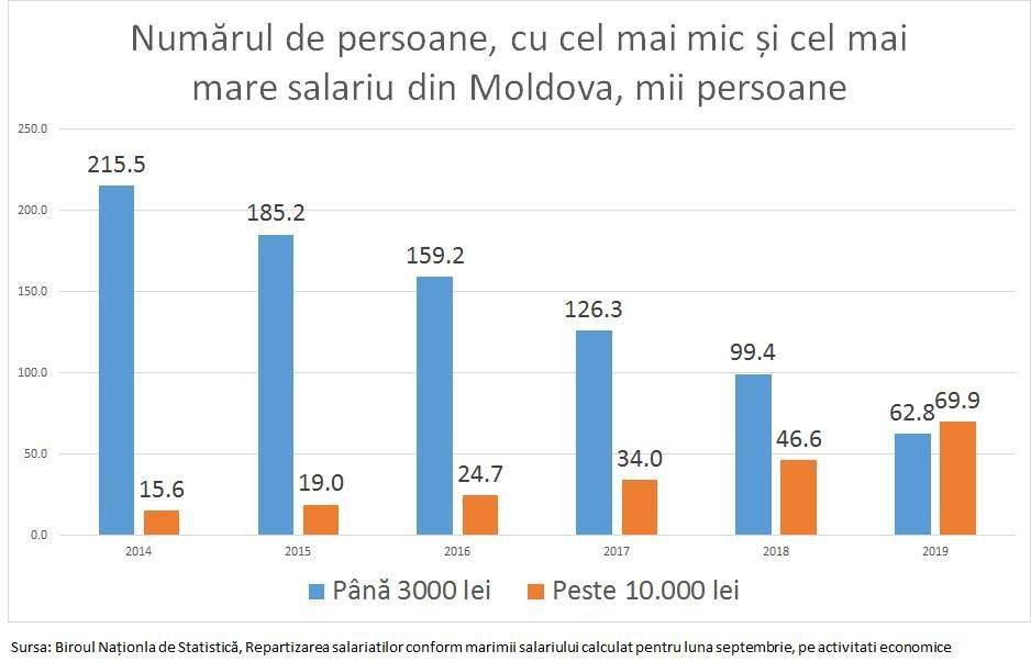 În aceeași perioadă numărul celor mai rău plătiți salariați cu salariu de până în 3 mii de lei a scăzut de 3,4 ori de la 215,5 mii persoane în 2014 la 62,8 mii persoane în 2019.