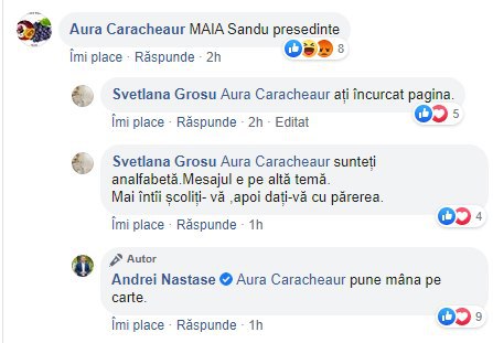 De multe ori acesta recurge la etichete şi un limbaj arogant, aşa cum s-a întâmplat în cazul postării Anei Caraghiaur, care a scris: “Maia Sandu, Preşedinte!”.