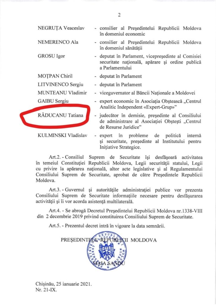 Președintele Maia Sandu a numit, astăzi, o nouă componență a Consiliului Suprem de Securitate (CSS). Pe lângă faptul că majoritatea membrilor sunt din PAS, Sandu își răsplătește și membrii staff-ului electoral, care au ajutat-o să ajungă în funcția de șef al statului. Astfel, unul dintre membrii CSS numit de Maia Sandu este Tatiana Răducanu, judecător în demisie și președinte al Consiliului de Administrare al AO “Centrul de resurse juridice”.