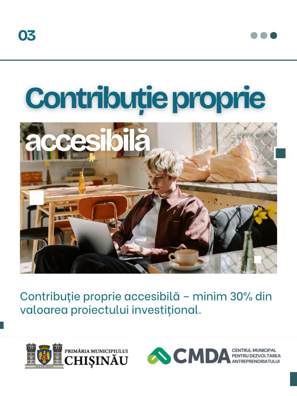 Condiția pentru accesarea fondurilor este contribuția proprie de minimum 30% din valoarea totală a proiectului. În plus, participanții vor face parte dintr-o comunitate activă de tineri și antreprenori care se sprijină reciproc și contribuie la dezvoltarea economică a Chișinăului.