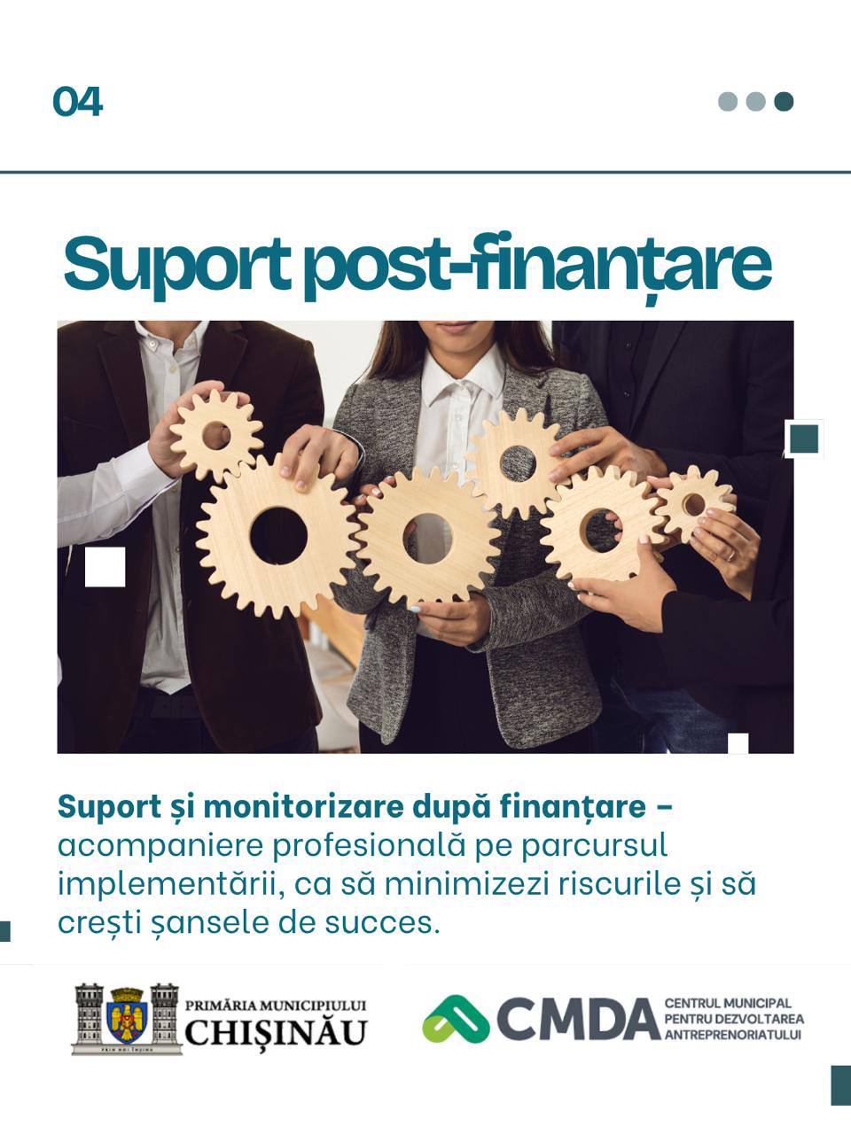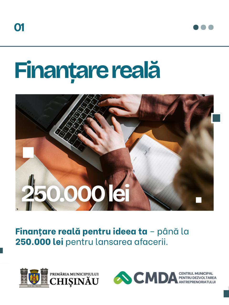 Programul oferă finanțare de până la 250.000 lei pentru lansarea propriei afaceri și sprijin complet pe parcursul dezvoltării proiectului. Participanții vor beneficia de instruire, consultanță și mentorat oferite de experții CMDA, precum și de monitorizare și suport după primirea finanțării, pentru a minimiza riscurile și a crește șansele de succes.