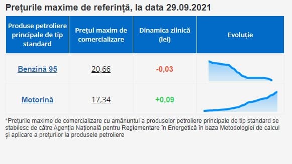 O nouă scumpire a motorinei. Agenția Națională pentru Reglementare în Energetică a publicat prețurile maxime de referință. Astfel, pentru un litru de motorină vom plăti mâine, 30 septembrie, cu încă 9 bani mai mult decât astăzi și va costa 17,34 lei. Un litru de benzină va costa 20,66, cu 4 bani mai puțin decât astăzi.