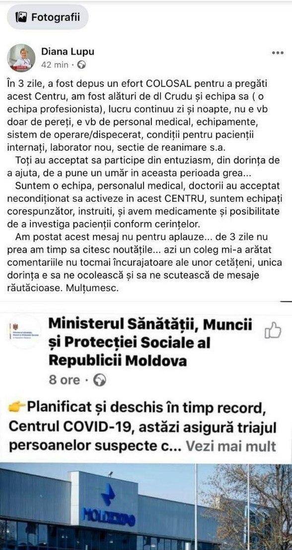 Diana Lupu a scris pe pagina sa de Facebook că “în 3 zile, a fost depus un efort colosal pentru a pregăti acest Centru, am fost alături de dl Crudu și echipa sa ( o echipa profesionista), lucru continuu zi și noapte, nu e vb doar de pereți, e vb de personal medical, echipamente, sistem de operare/dispecerat, condiții pentru pacienții internați, laborator nou, secție de reanimare s.a”.