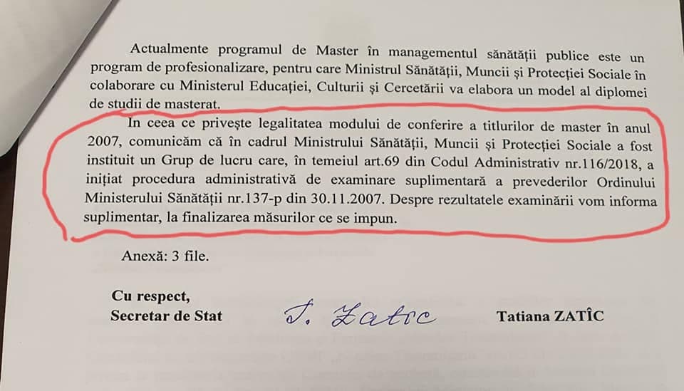 Legalitatea eliberării diplomei de master pe numele Alei Nemerenco va constitui obiect de investigație suplimentară din partea unui Grup special de lucru, creat din reprezentanți ai ministerelor Sănătății, Muncii și Protecției Sociale și Educației, Culturii și Cercetării, precum și din partea Universității de Stat de Medicină și Farmacie. Acesta este răspunsul dat de secretarul de stat al Sănătății, Tatiana Zatîc, da ca urmare a interpelării deputatului PSRM, Alla Darovannaia.