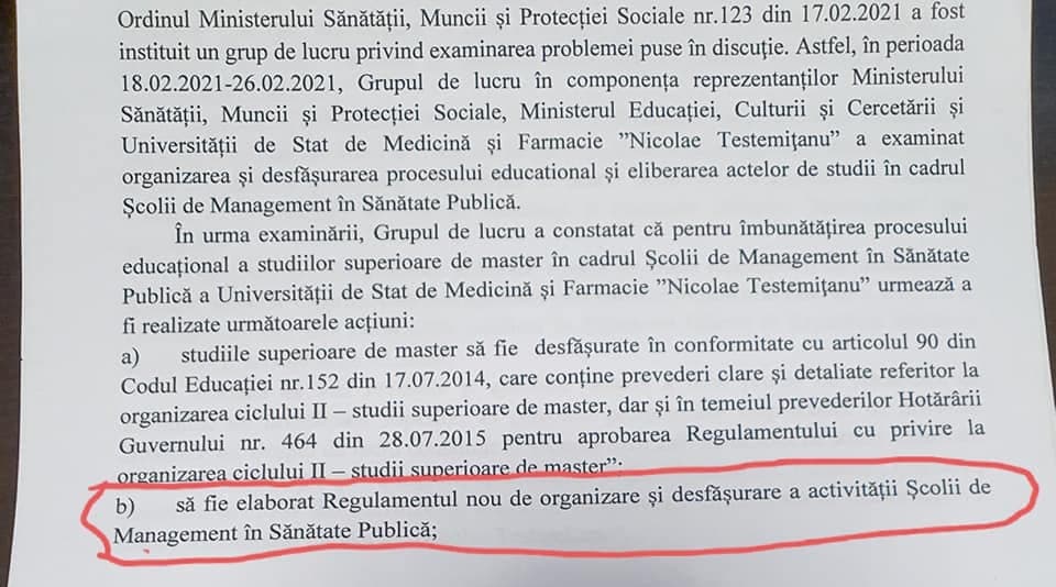 Grupul de lucru a mai venit cu un șir de propuneri de îmbunătățire a cadrului legal, pentru a fi evitate astfel de situații. Membrii comisiei au recomandat și elaborarea unui nou Regulament de organizare și desfășurare a activității Școlii de Management în Sănătate Publică.