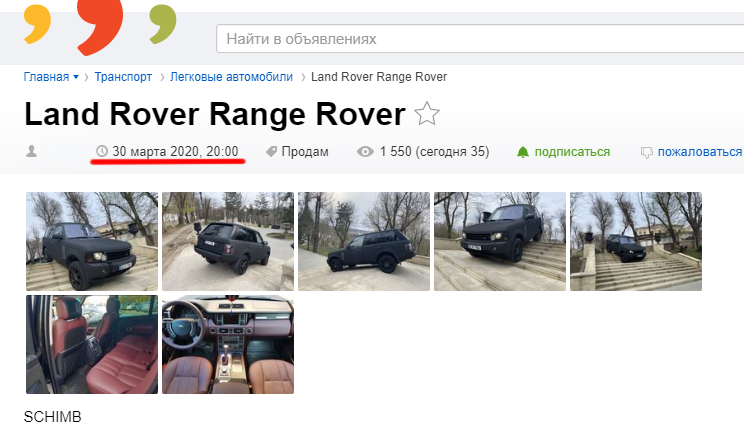 Anunțul de vânzare cu fotografiile mașinii de model Range Rover a fost plasat pe 30 martie la ora 20:00.