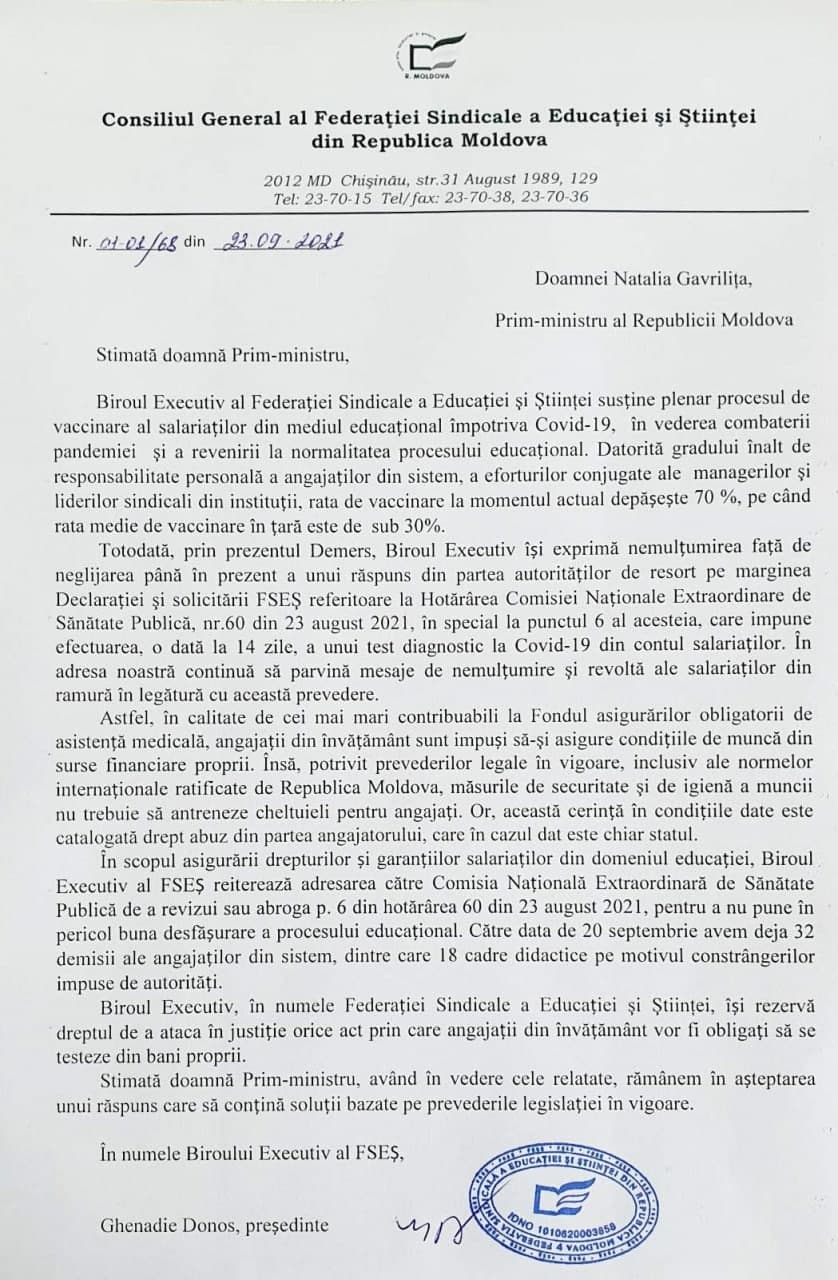 Sindicaliștii din domeniu își exprimă nemulțumirea față de decizia autorităților de a obliga profesorii să se vaccineze, ori să prezinte, o dată la 14 zile, un test anti-COVID, făcut din banii proprii. Pentru a nu pune în pericol buna desfășurare a procesului educațional, profesorii îi cer guvernării să-și revizuie decizia. Totodată, sindicaliștii anunță că își rezervă dreptul de a ataca în instanță orice act, prin care profesorii vor fi obligați să se testeze din banii proprii.