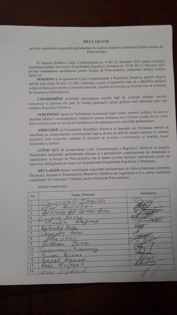 Precizăm că liderul fracțiunii parlamentare a PSRM, Corneliu Furculiță, a prezentat declarația majorității parlamentare, care subscrie sub propunerea de înaintare a candidaturii lui Vladimir Golovatiuc la funcția de prim-ministru. De asemenea, a fost făcută o adresare oficială către Președintele țării, ca să fie desemnat, conform normei constituționale, candidatul majorității parlamentare la funcția de premier.