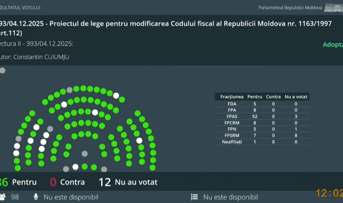Parlamentul a aprobat în lectura a doua, finală, proiectul de lege a Fracțiunii Partidului Nostru, care majorează plafonul de înregistrare în calitate de plătitor TVA. Pentru aceasta au votat 86 de deputați.